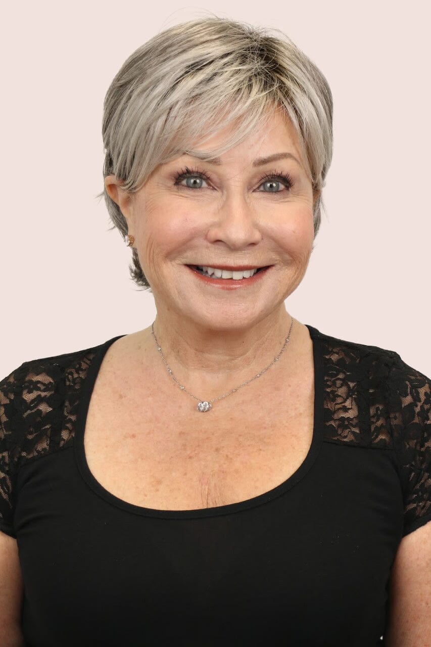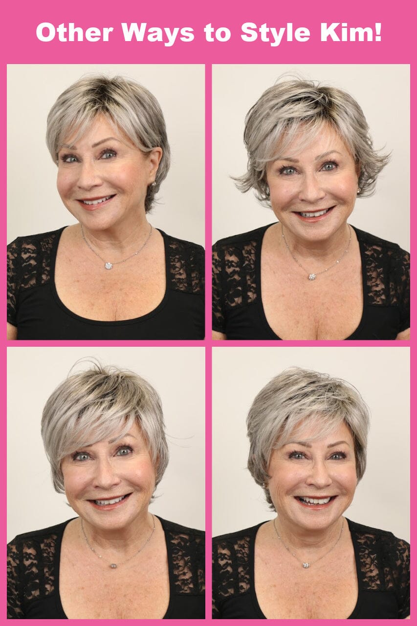 Petite Kim has a 20.5" circumference. It is about 1" smaller than our average size cap. Introducing our newest wig, Kim! This wig features a beautifully textured, short cut with subtle layers that add natural volume and movement. The open-weft cap ensures breathability and Velcro adjustment tabs at the nape allow for the perfect fit. Whether you prefer a sleek, polished look or a more tousled, carefree vibe, this versatile style adapts to your mood and occasion.